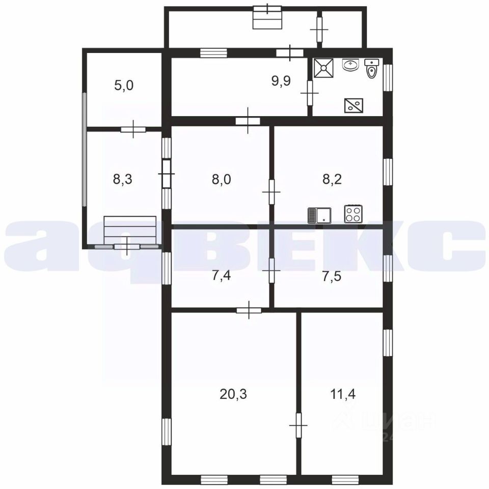 Дом одноэтажный, общей площадью 62,8 квадратных метров. Внутренняя планировка включает четыре комнаты различного размера общей жилой площади 46,6 квадратных метров. Кухня 8,2 квадратных метра. Дом построен в 1972 году. Стены из бревен диаметром 220мм, фундамент бетонный ленточный, кровля железо.