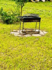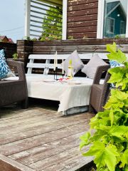 Перед домом терраса с мебелью для отдыха, мангальная зона.