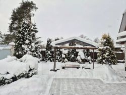 - ФУНДАМЕНТ: плита заливная, СТЕНЫ - толщина бревна - 25 см., стеклопакеты, стеклянная дверь с выходом в сад, к беседке;