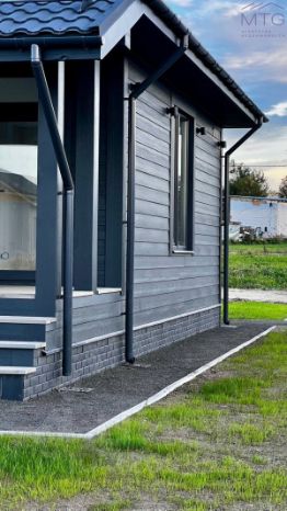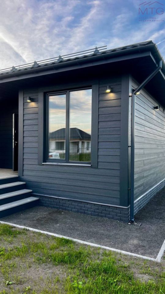 Материалы: фиброцементная доска (не требует обслуживания и перекраски), металлочерепица, двухкамерные стеклопакеты.