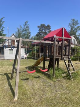 Есть сарай, летний душ и детская площадка.