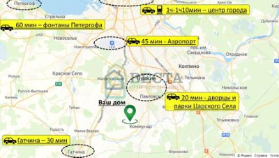Удачное расположение посёлка - в пешей доступности от всей необходимой инфраструктуры г. Коммунар, школа, детский сад, сетевые магазины находятся всего в 2,5 км. Ближайший продуктовый магазин - в 1 км по пути в посёлок - большая "Пятёрочка". Всего в 10-15 минутах на автомобиле - исторические места, парки и дворцы г. Пушкина и г. Павловска. При этом, до Павловска - всего 6 км.