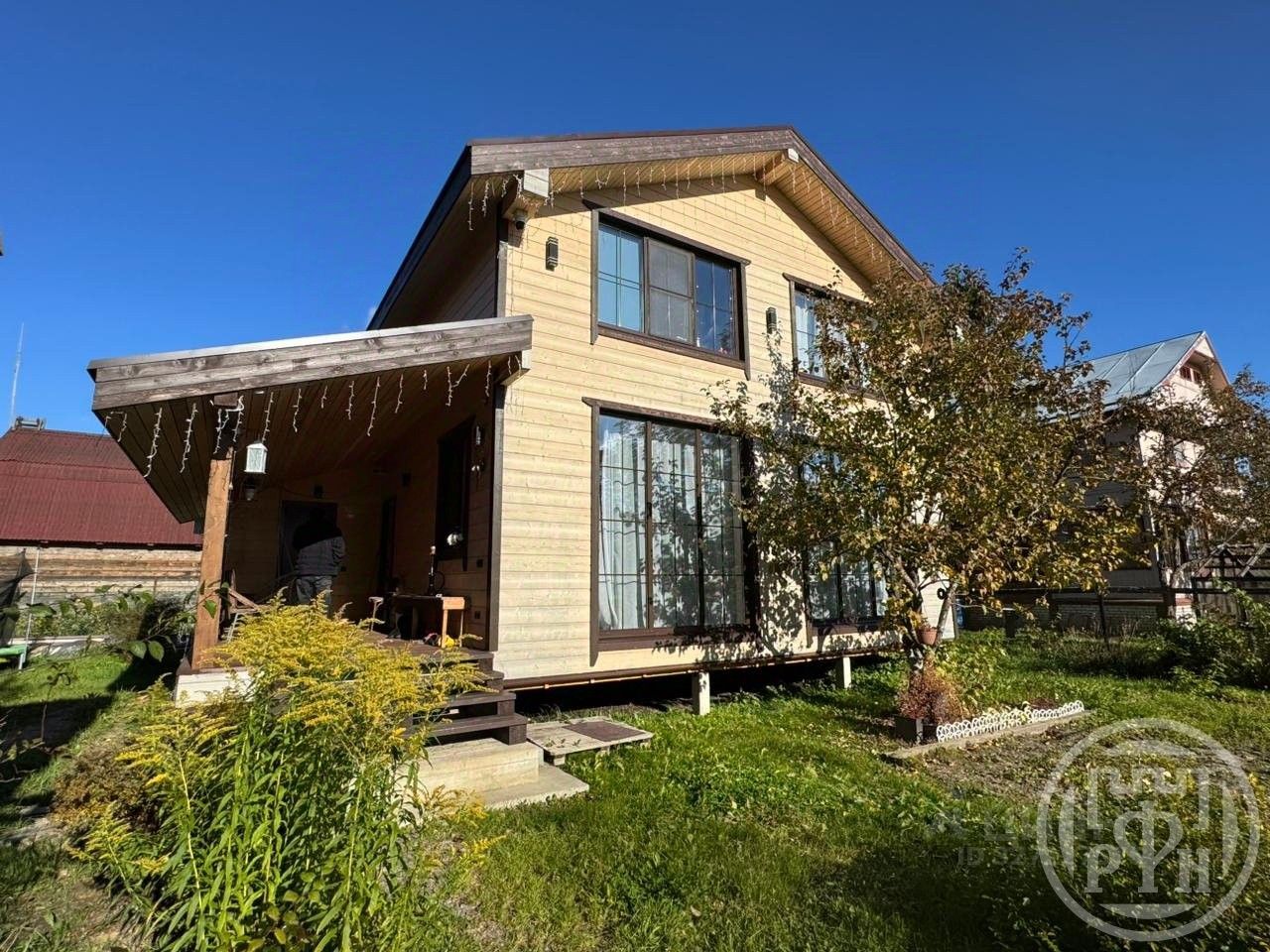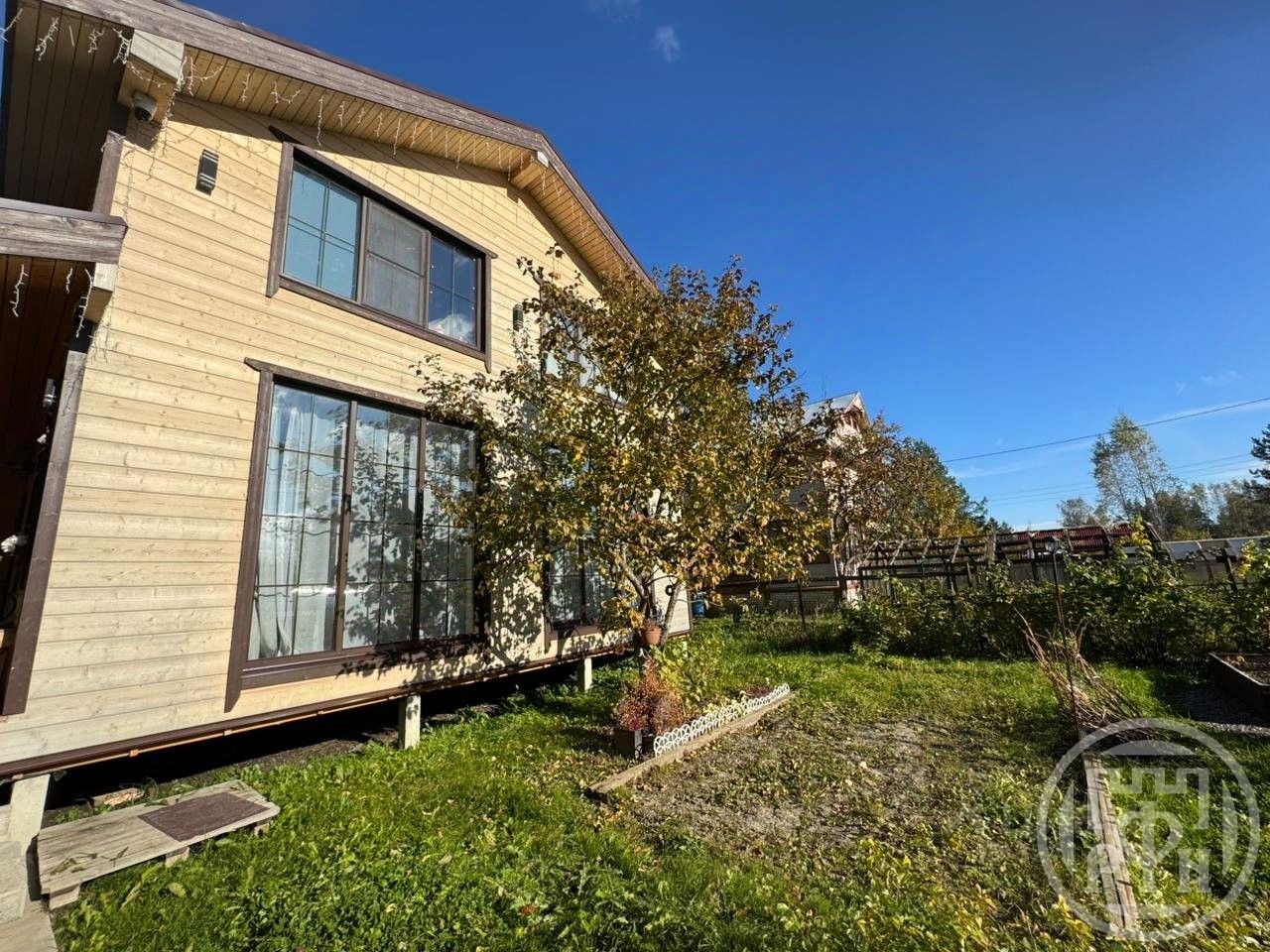 - Просторный участок с садом, где растут яблони.