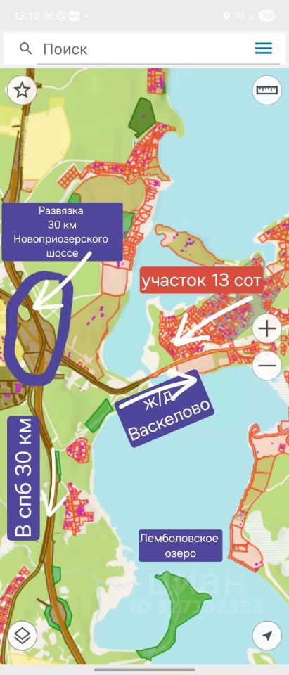 ИЖС 13 соток у Лемболовского озера. Газ по границе, 20 мин от КАД, 15 Квт (есть возможность увеличить мощность до 30 Квт).