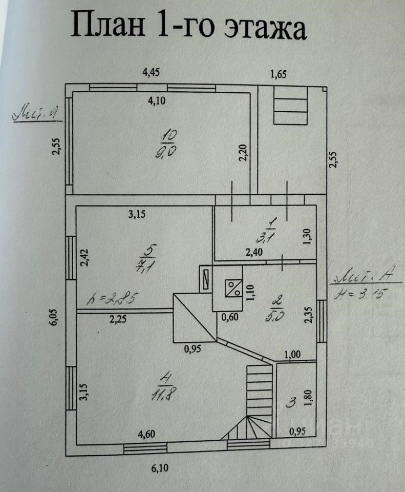 На первом этаже, находятся: гостиная 11,8 м2, спальня 7.1 м2, кухня 5 м2, кладовая 1.7 м2 прихожая 3,1 м2, и веранда 9 м2. Высота потолка 2.85 м2. Из гостиной лестница ведет на второй этаж.
