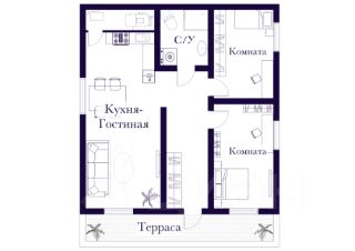 Кухня, просторная гостиная, две изолированные комнаты, санузел, прихожая, терраса, кладовая-котельная.