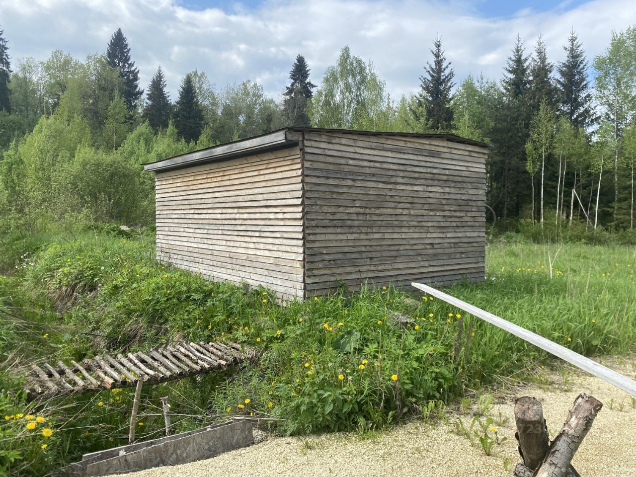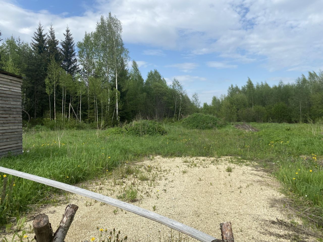 Участок прямоугольный, соседей пока нет, есть елки, сосны, березы.
