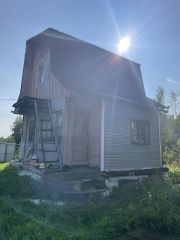 Дачный домик, крепкий, деревянный, отапливается электричеством, на первом этаже две комнаты, на втором - одна. Есть хорошая, теплая баня на дровах, летняя кухня. Участок разработан, есть яблони и плодовые кустарники. Подъезд к участку круглогодичный.