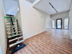Потолки — натяжные с теневым профилем, светлого оттенка, что визуально расширяет пространство. Освещение организовано световыми треками, которое позволяет менять и дополнять освещение под любые запросы.