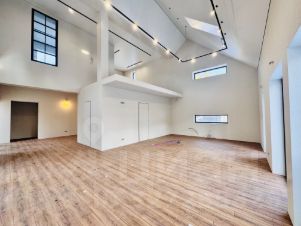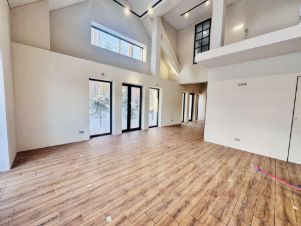 просторная гостиная со вторым светов и высотой потолка в 7 метров с дымоходом для камина;