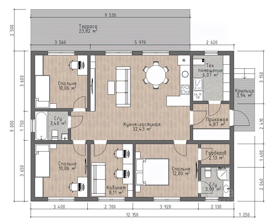 Просторная кухня-гостиная и 3 спальни.
