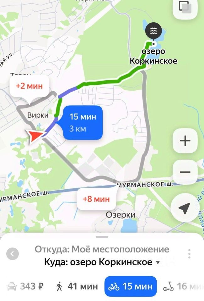До Коркинского озера 2 км по просёлочной дороге, проезд на велосипеде, так же занимает минут 15.