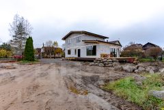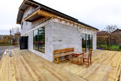 - кухня-гостиная 32,2 м2 с выходом на крытую террасу 8.1/4-32 м2 и открытую 2,5/8-20 м2 (сделан каркас на сваях)