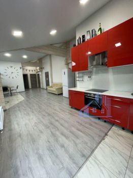 просторная кухня-гостиная с высокими потолками и панорамными окнами.