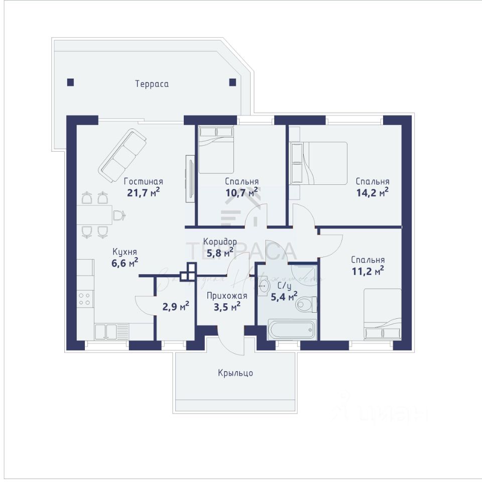 1 этаж - просторная кухня-гостиная с выходом на террасу, 3 изолированные комнаты, прихожая, с/у.
