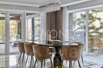 Первый этаж единое пространство, в котором соединены гостиная с камином с отделкой из оникса, кухня и столовая с выходом на террасу. Кухня с итальянскими комплектующими и техникой Kuppersbusch. Зонирование делает особенно красивым сверкающие люстры и отделка камнем.