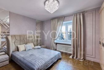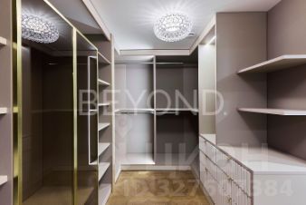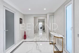 Мастер-спальня с огромной кроватью от Fendi, брутальные лампы и мебель от Eichholtz. Стены спальни обшиты тактильно приятным текстилем. Мастер-гардеробная комната изыскана, функциональна и вместительна.