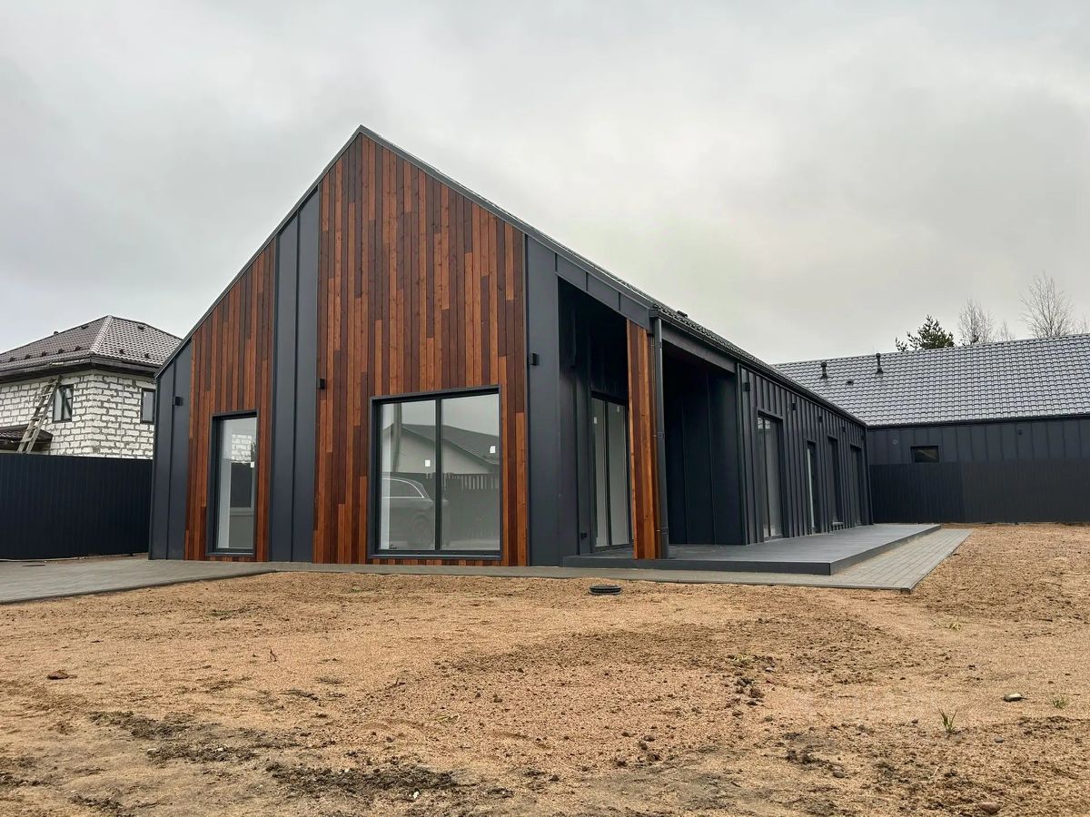 Современный дом с отделкой общей площадью 170м2 на участке 9 соток, в cтиле Barn House на ж/б плите из газобетона.