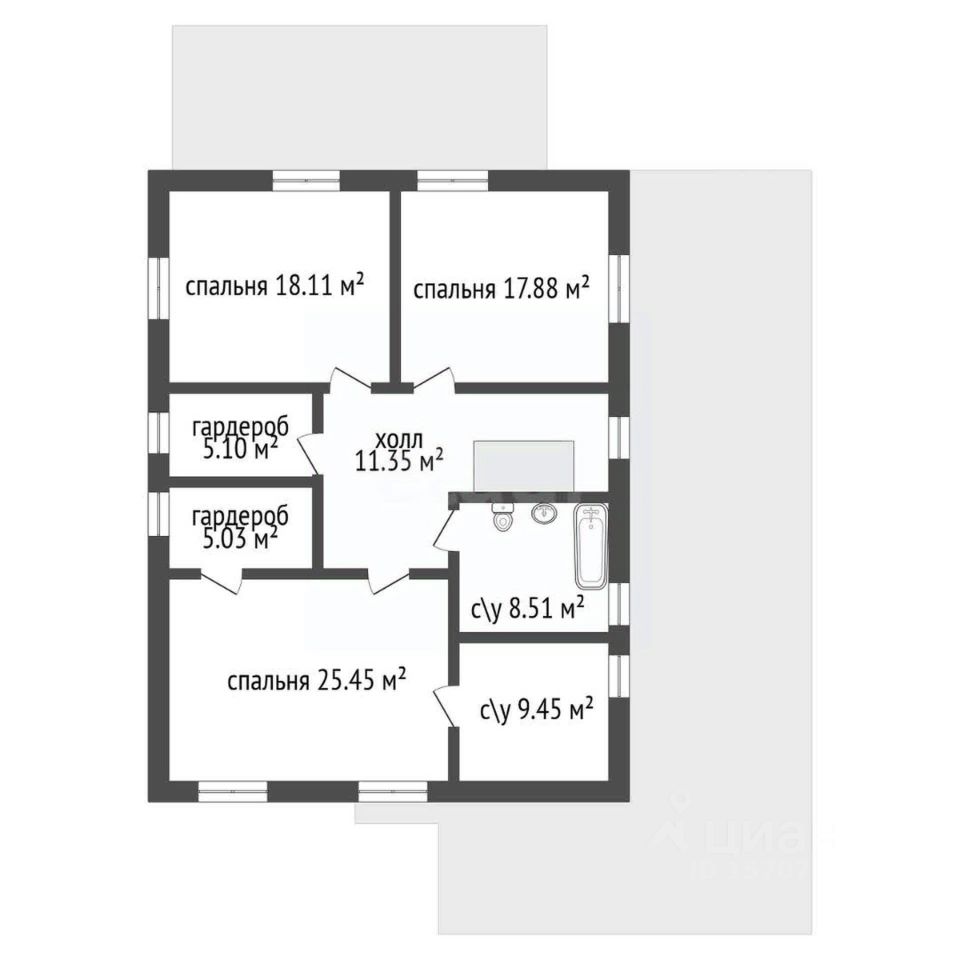 На втором этаже находятся мастер-спальня (25,4 м²) с собственным санузлом (9,4 м²) и гардеробной (5 м²), а также две детские комнаты (17,8 м² и 18,1 м²) и общий санузел (8 м²).