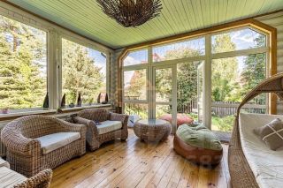 * уютная застеклённая веранда с ротанговой мебелью.