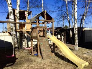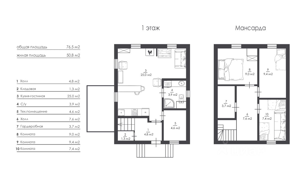 Планировка: на первом этаже кухня-гостиная (20м2) с печью-камином, ванная с душевой кабиной, туалет, комната и подсобное помещение; на втором (мансардном) этаже три спальни и гардеробная. Дом оборудован всей необходимой бытовой техникой.