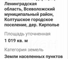 Продаётся участок, кадастровый номер 47:09:0104005:1331, категория — земли населенных пунктов, Ижс, площадь- 1019 квм, расположен в сложившейся престижной застройке — популярных мест деревня Кирполье -соседнее Воейково. На участке своя скважина, газ по границе, люк городской канализации на участке, электричество — столб на границе.