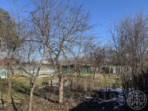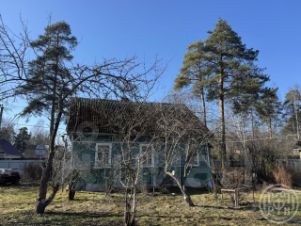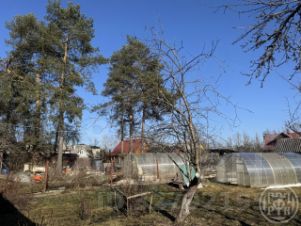 На участке растут плодовые деревья и кусты, а также сосны, создавая приятную атмосферу.