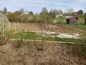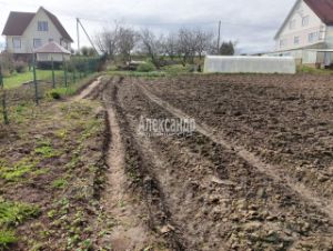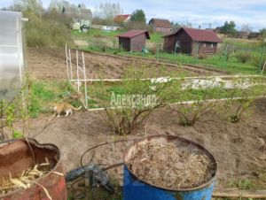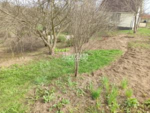 Участок огорожен только с одной стороны. Имеет вытянутую форму и небольшой уклон. Участок разработан, есть яблони, сливы, груши, смородина, клубника.
