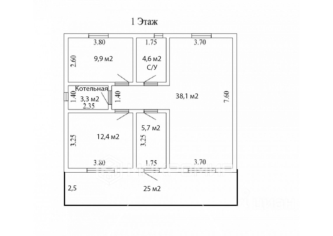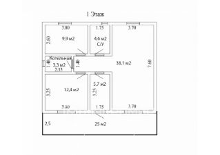 Планировка дома эргономична и функциональна: просторная прихожая 5.7 кв.м., кухня-гостиная 38.1 кв.м (установлена встроенная кухня) кв. м. , санузел 4.6 кв.м, котельная 3.3 кв.м, спальни 9.9 кв.м и 12.4 кв.м., терраса 25.кв.м!