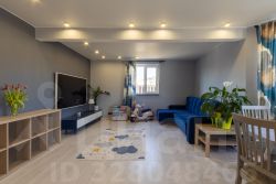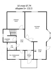 На 1-ом этаже кухня с отдельной столовой зоной в эркере позволит всей семье собираться по вечерам за ужином в уютной обстановке, гостиная для просмотров фильмов, спальня- гостевая (или кабинет) и туалет с душевой кабиной, прихожая. Кухонная мебель со встроенной техникой: газовая варочная панель, духовой шкаф, холодильник. Теплый пол по всему 1-му этажу. Комфортная деревянная лестница на 2-й этаж, под лестницей места для хранения.