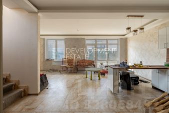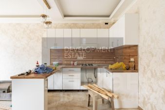 Кухня итальянского производства с премиальной фурнитурой. В отделке — лепнина и фрески ручной работы. Центральный акцент гостиной — люстра высотой три метра, работающая как арт-объект. Мебель дорогая, но подобрана с учётом функциональности.