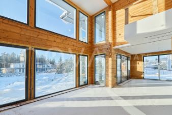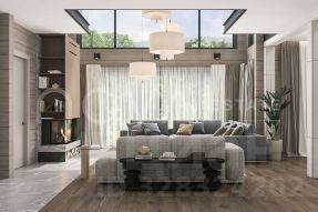 Эстетика интерьера строится на естественности материала: клееный брус является не только конструктивной, но и интерьерной основой, создавая теплую акустику и тактильность пространства. Свет и виды являются частью оформления. Каждый из двух уровней имеет собственную логику организации.