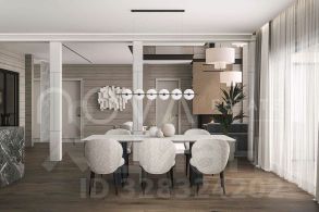Первый этаж решён как многофункциональная платформа, разделённая на три блока. Общественная зона с гостиной и кухней-столовой перетекает в террасу. Отдельный гостевой блок с двумя спальнями и кухней предназначен для длительных визитов. Третий контур — спа-зона с хамамом, сауной, комнатой отдыха и кинозалом, имеющая свой выход на участок. Такая схема позволяет одновременно проживать, принимать гостей и отдыхать, не пересекаясь по сценариям.