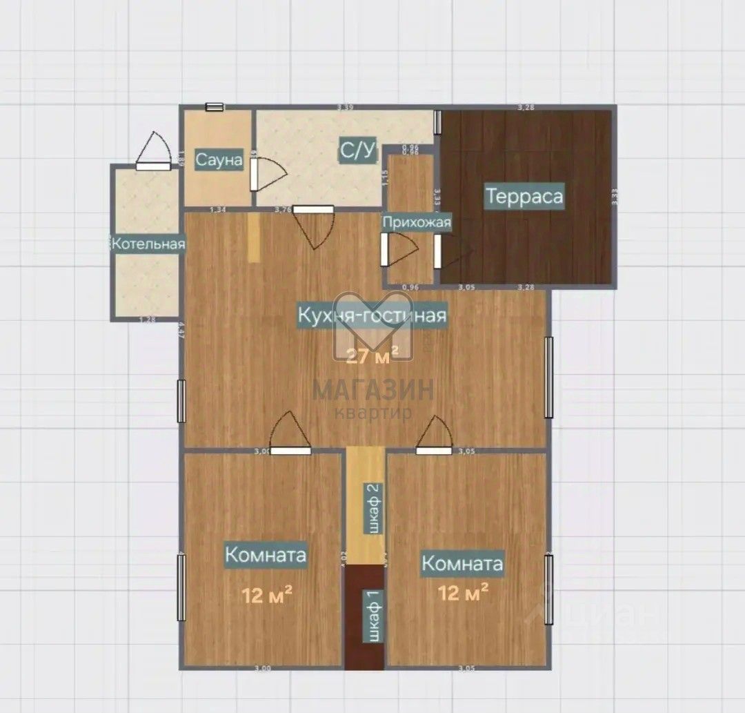 Каркасный дом для круглогодичного проживания включает в себя уютную террасу, прихожую, светлую и просторную кухню-гостиную (27 м2), две комнаты (по 12 м2) с встроенными шкафами, санузел с душевой кабиной и небольшой сауной, а также помещение котельной.
