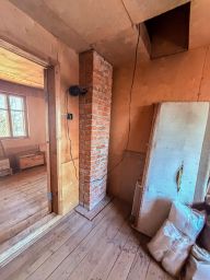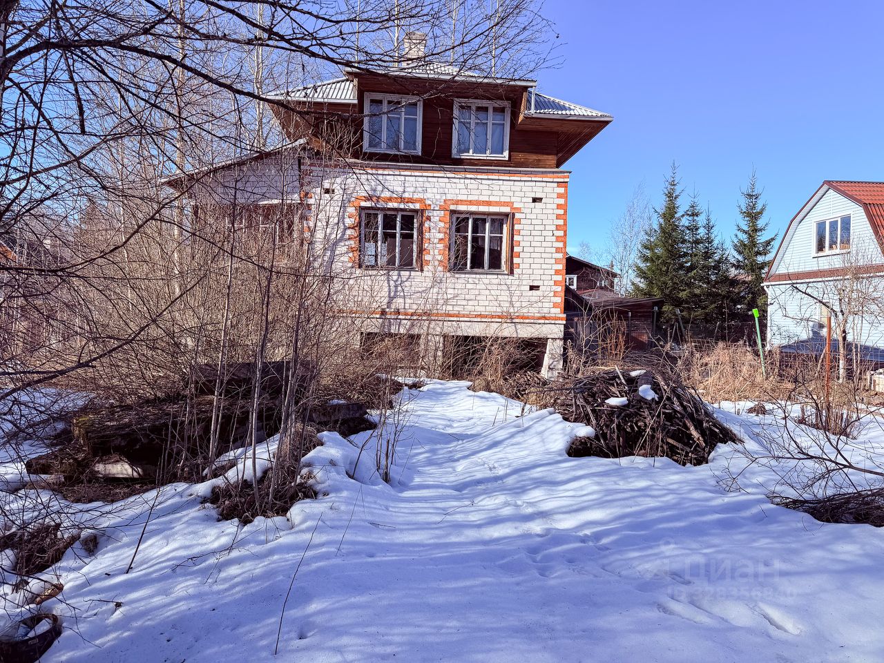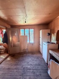 На территории стоит деревянный дом на бетонных сваях. Цокольный этаж выполнен из бетона, первый этаж сделан из бруса и облицовован кирпичом, второй этаж брус. Дом можно достроить, либо использовать без вложений как временное жилье на период строительства нового дома.
