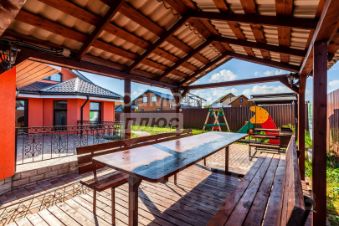Уютная зона барбекю с беседкой и мангалом.