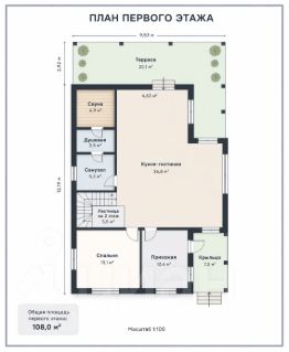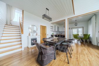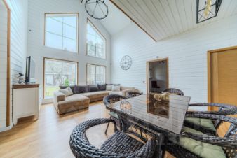 1 этаж: Просторная кухня-гостиная с шикарным вторым светом и панорамными окнами. Ванная комната с душевой и собственной сауной. Уютная гостевая спальня, прихожая с гардеробной и техническое помещение.