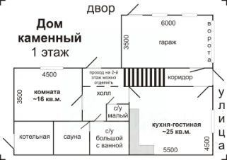 1-й этаж: вход с улицы в коридор, направо - вход в гараж 21 кв.м., налево - в кухню-гостиную 25 кв.м., далее: холл, комната 16 кв.м., малый и большой с/у с ванной, сауна, котельная, выход во двор, лестница на 2-й этаж;