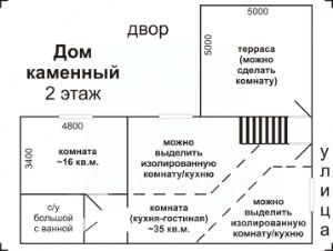 2-й этаж: подъем из холла 1-го этажа, налево - выход на террасу 25 кв.м. (можно сделать еще одну комнату), направо - в проходную комнату (кухню-гостиную) 35 кв.м. с двумя окнами (можно выделить кухню + комнату или две изолированные комнаты ), далее: комната 16 кв.м., и большой с/у с ванной; вход на 2-й этаж можно сделать отдельным.
