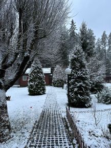 На 13 сотках выполнен ландшафтный дизайн, сделан газон, высажены растения, на 12 сотках оставлена природная растительность: сосны, лиственные деревья. При желании можно построить большой дом.