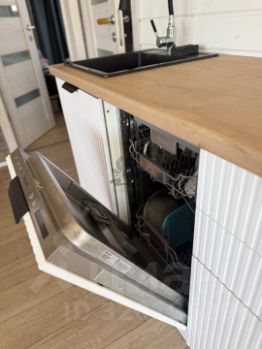 Кухня выполнена в минималистичном дизайне: функциональная рабочая зона, встроенная техника и тёплая деревянная столешница делают её не только красивой, но и удобной для повседневной жизни.