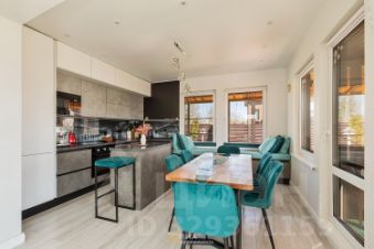 Просторная кухня гостиная со встроенной техникой: холодильник, посудомоечная машина, индукционная плита, духовой шкаф, микроволновая печь, фильтр для питьевой воды. Отдельного внимания заслуживает стол из натурального дерева с эпоксидной смолой — центральный элемент интерьера.