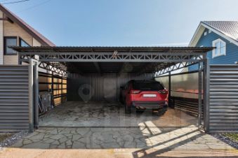 Навес на 2 машины с прямоугольной кладовой для инвентаря. В комплекте — бензиновая газонокосилка и автоматический бензиновый генератор. Светодиодное освещение, пол из природного камня.