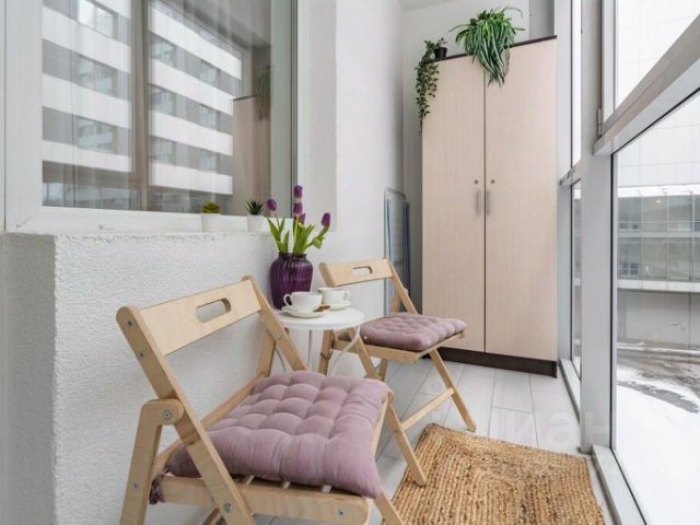 Балкон с панорамным остеклением, кофейный столик и стулья.