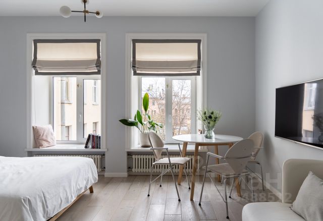 Студия "White" находится на 5 этаже в доме 1911 года постройки. Из больших окон с низкими подоконниками открывается вид на крыши города и Владимирский собор.