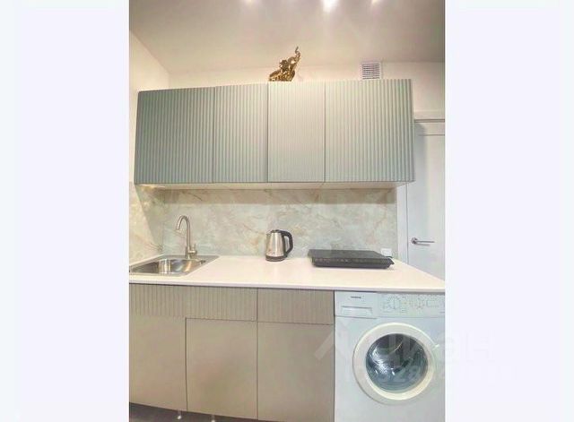 Стиральная машина, кондиционер, гладильная доска, фен, утюг, сушилка для белья, персональные средства гигиены (гель для душа, шампунь, тапочки), на окнах рулонные шторы.