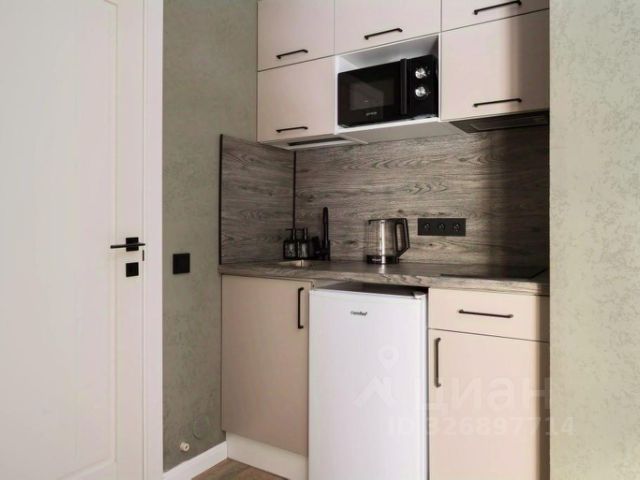 Кухня: варочная панель, микроволновка, чайник, холодильник, посуда.