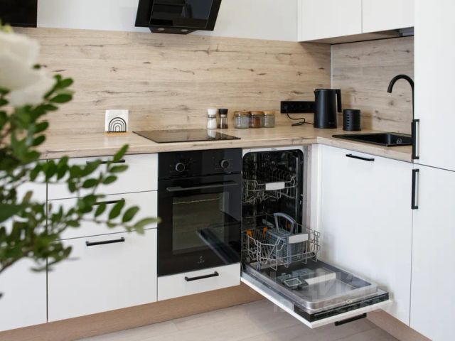 * Кухня с посудой, кухонными принадлежностями, стол барный, барные стулья.