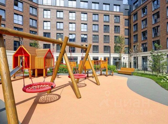 Двор без машин. Во дворе фонтаны, современные зоны отдыха, детские площадки и тренажёры.