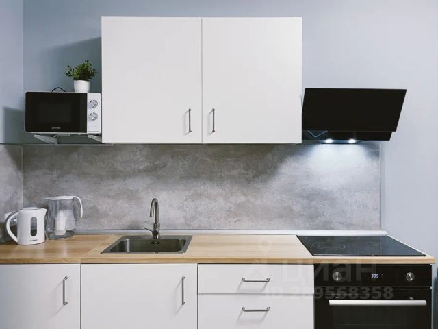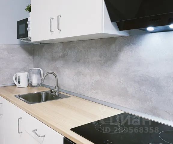 Кухня со всем необходимым (посудомоечная машина, холодильник, варочная панель, микроволновая печь, чайник, а так же посуда, приборы и фильтр для питьевой воды)
